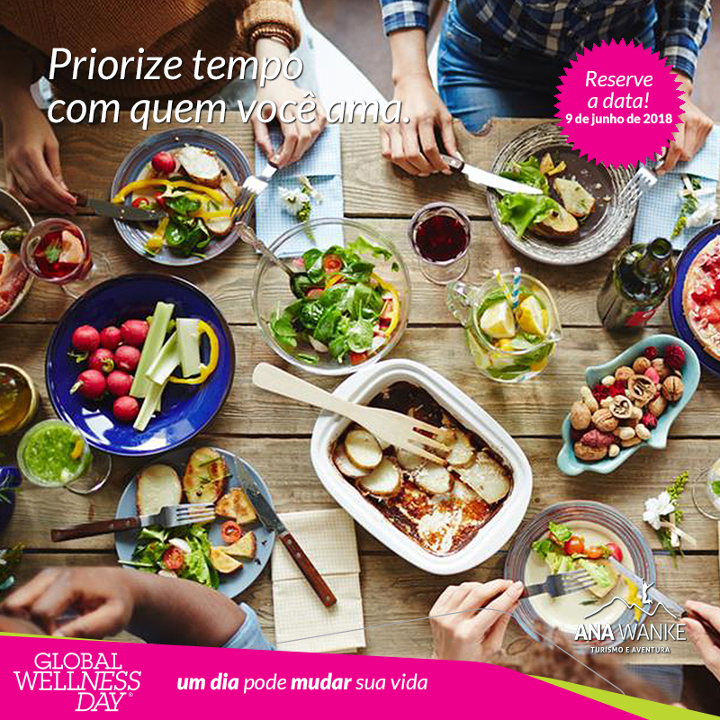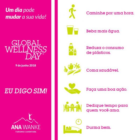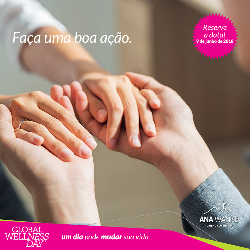 Através da Lapinha Spa, no ano passado (2017) tivemos o primeiro contato com este projeto sem fins lucrativos, realizado por voluntários, cujo objetivo é influenciar pessoas a ter uma vida mais saudável. Imediatamente abraçamos o movimento e na ocasião a nossa empresa Ana Wanke Turismo e Aventura fez algumas ações para apoiar o Dia Mundial do Bem-Estar (Global Wellness Day).