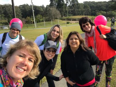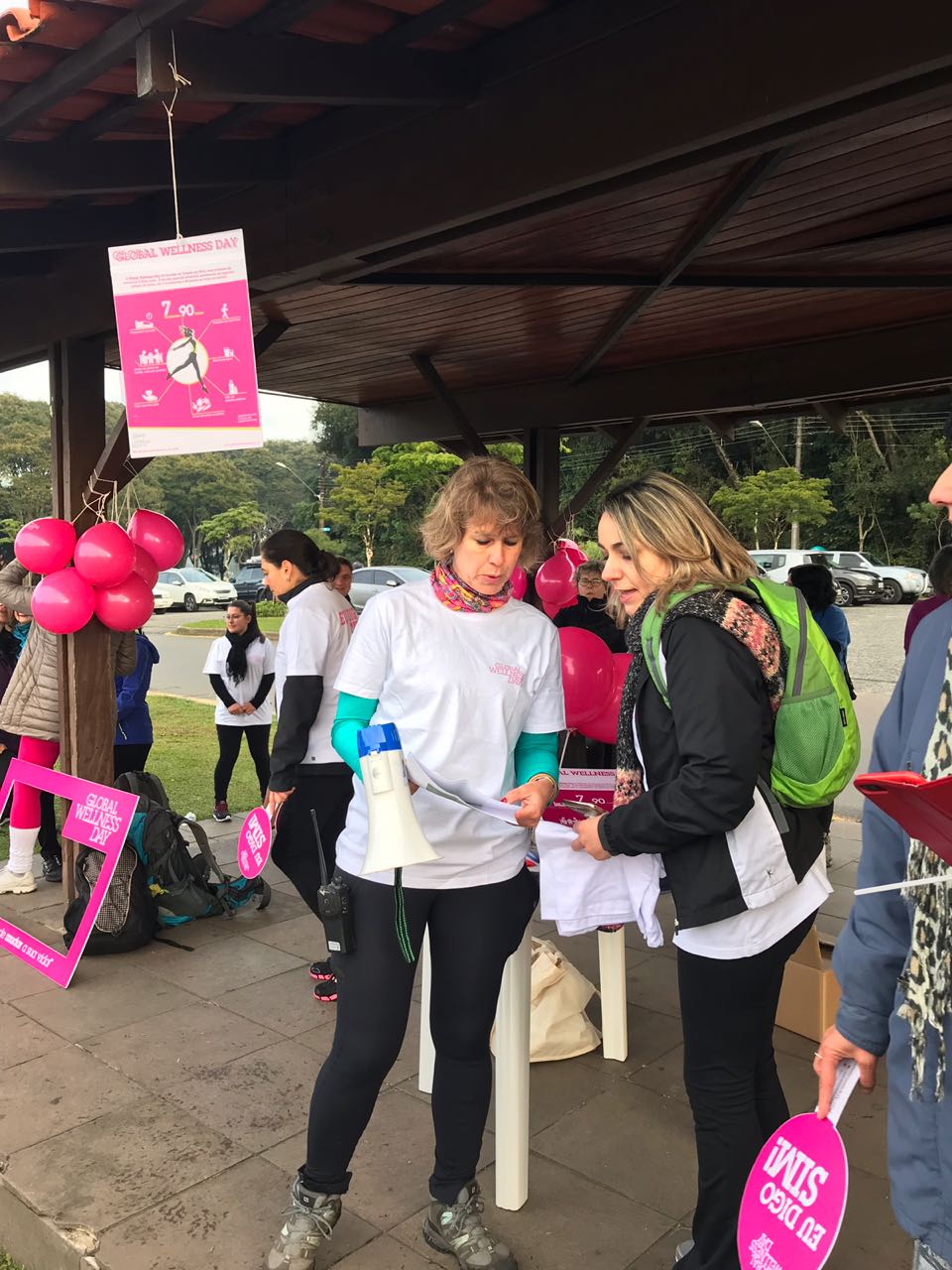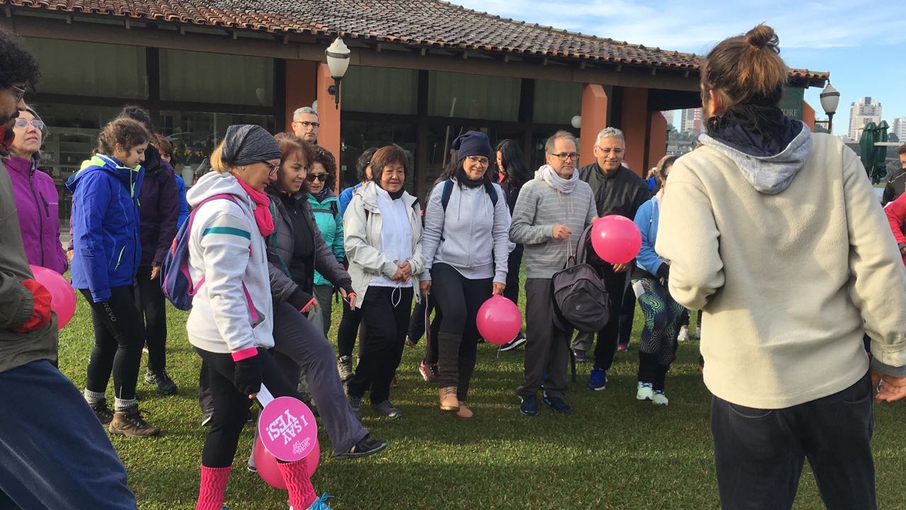 Toda a logística foi minuciosamente estudada. Dividimos as tarefas e colocamos em prática. Estávamos preparados com bexigas personalizadas “Global Wellness Day”, um simpático frame com o dizer “um dia que pode mudar a sua vida”, placas “Eu digo SIM”, brindes, trilha marcada, rádios distribuídos entre as 5 pessoas (da Equipe Ana Wanke e da equipe da Lapinha) para monitorar a caminhada. Sentimos muita energia positiva da galera que começou a se reunir no parque para espantar o frio de 2 graus!