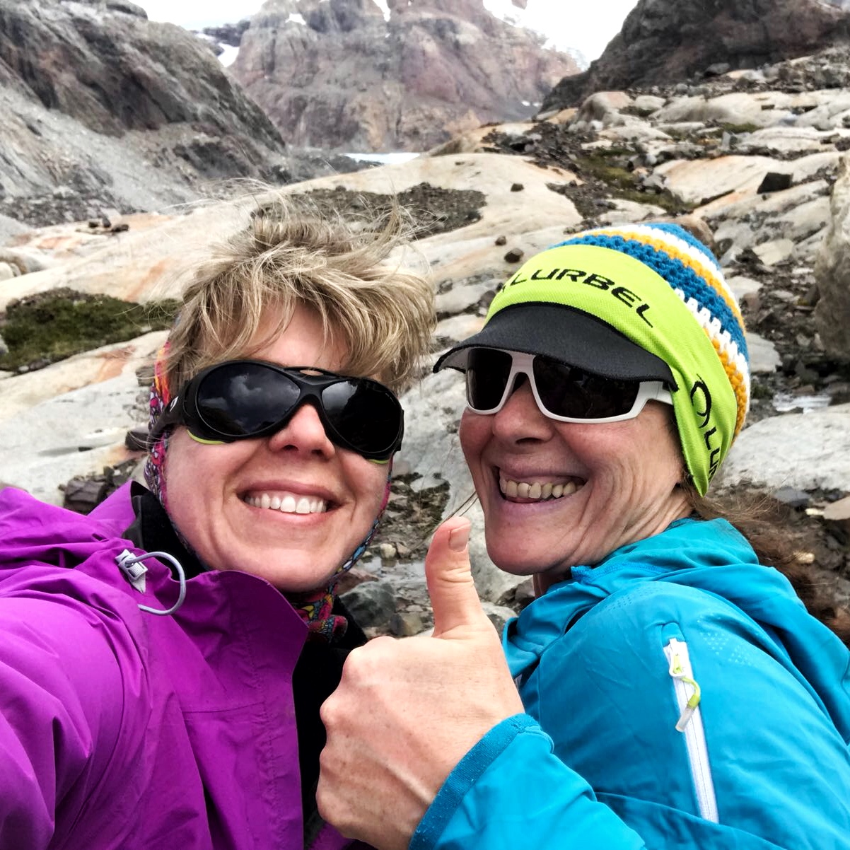 Chegou um desafio que eu desconhecia: a passagem de uma tirolesa. Ela passava por cima de um canion onde corria a água de desgelo que vinha da direção do Passo Marconi. Nossos guias passaram duas cordas, colocamos cadeirinhas e fomos lá! Força nos braços, pois o ponto de chegada era mais alto que o ponto de partida. Fui a última a cruzar, pois estava brigando com o vento. Aliás foram muitas as DR com o vento…
