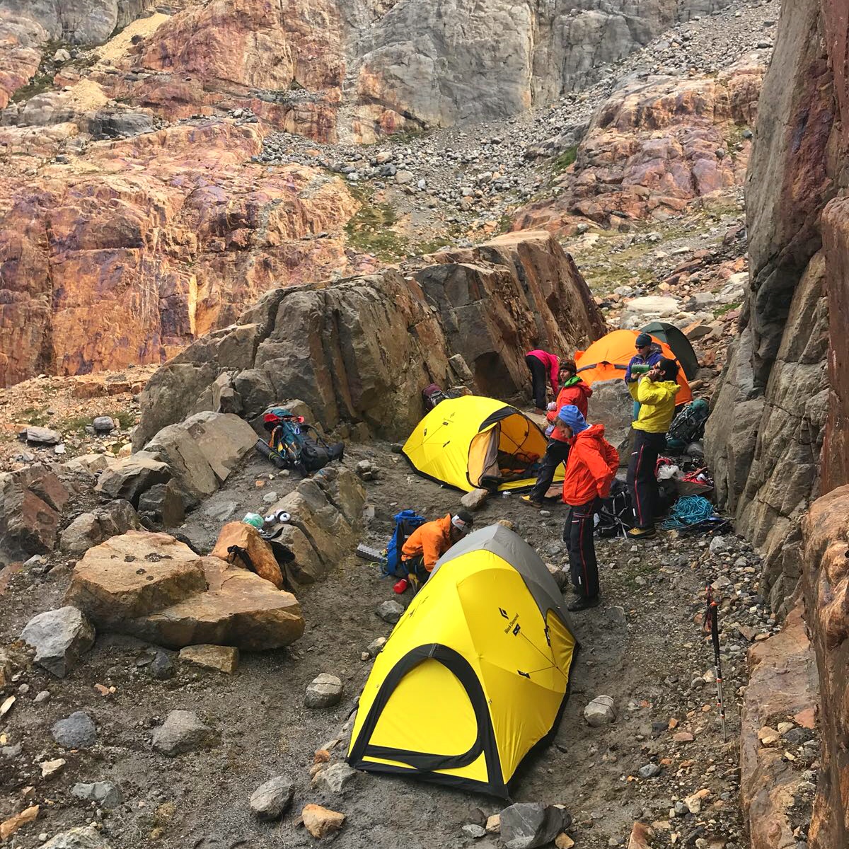 Chegando do outro lado, rapidamente chegamos ao nosso acampamento. Nós, as “meninas”, ajudamos a equipe a montar as barracas, mas o Jaison, o cliente coreano, ficou só fotografando e observando. Ele levou a própria barraca (ou melhor enviou), que era verde escura.