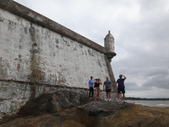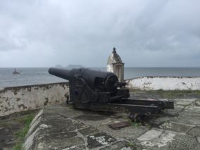 No alto do Mirante da Fortaleza ainda existem canhões da Segunda Guerra Mundial apontados para a entrada da baía.